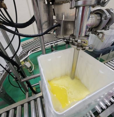 皮ごと搾られたシークヮーサー果汁は、そのままサンペールに充填され、一度冷凍保管されます。
