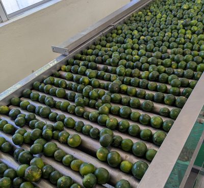 ベルトコンベヤーで次々と運ばれていくシークワーサー達。