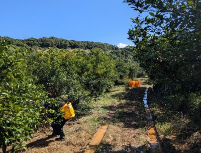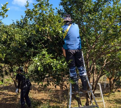 この日は朝から作業服を着て、太陽の下でシークヮーサー収穫に夢中になっています。