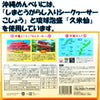 原材料名:澱粉、いか、豚肉、ラフテー風味調味液、たこ、植物油脂、泡盛、砂糖、明太子、醤油、濃厚ソース、つゆ、シークヮーサー加工品、加工黒糖、おろし生姜、ねぎ、鰹節、甘味料、調味料、増粘剤、酒精、セルロース、ナイアシン、香辛料抽出物、着色料、酸味料、香料(一部に小麦・いか・大豆・豚肉・もも・りんごを含む)