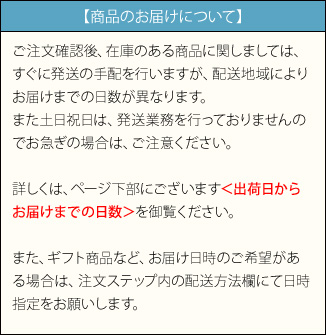 商品の品質につきましては、万全を期しておりますが、万一不良・破損などがございましたら、商品到着後8日以内にお知らせください。上記日数が過ぎた場合のお客様都合による返品・交換はお受けできませんので、ご了承ください。お客様のご都合による返品・交換の際の配送料は、お客様ご負担でお願いいたします。また、商品到着時と同じ状態で、返送ください。