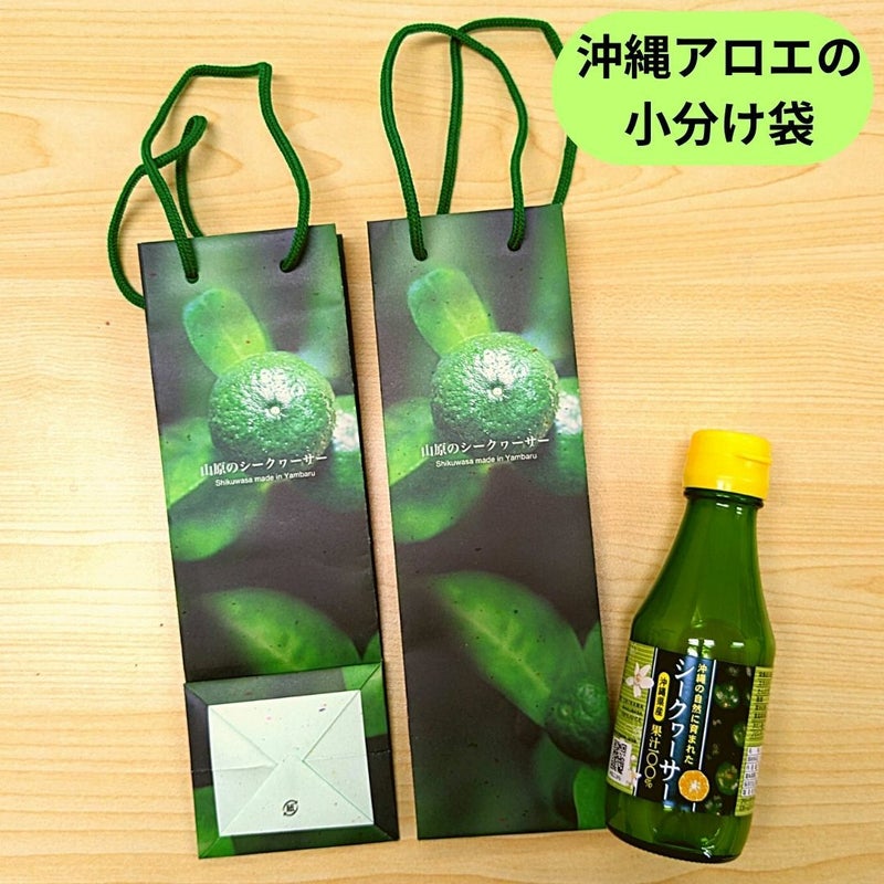 沖縄アロエのシークヮーサー150ml用の紙袋ですが、1Lペットボトルも入ります。500ml瓶に関しましてはギリギリで入る大きさです。シークワーサー商品を配る際にぜひご利用下さい。